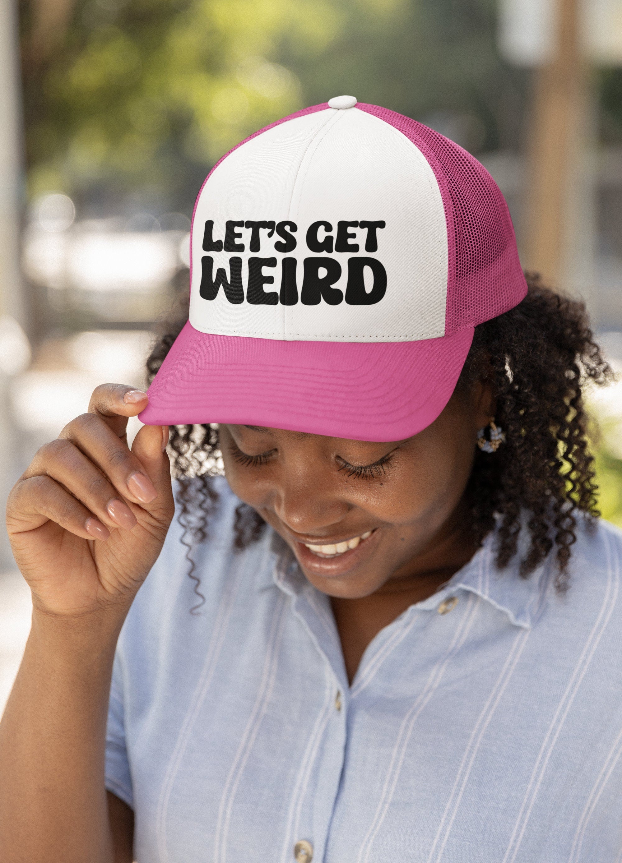 🧡This Let's Get Weird trucker hat is perfect for any party. Bachelor/bachelorette parties, birthdays, friend reunions, college game days, cruises, vacations, and more. Make your friends laugh when you wear it out or give it as a gift to your friend who you know loves to party. Choose your hat color and your custom hat with black text will be made to order.